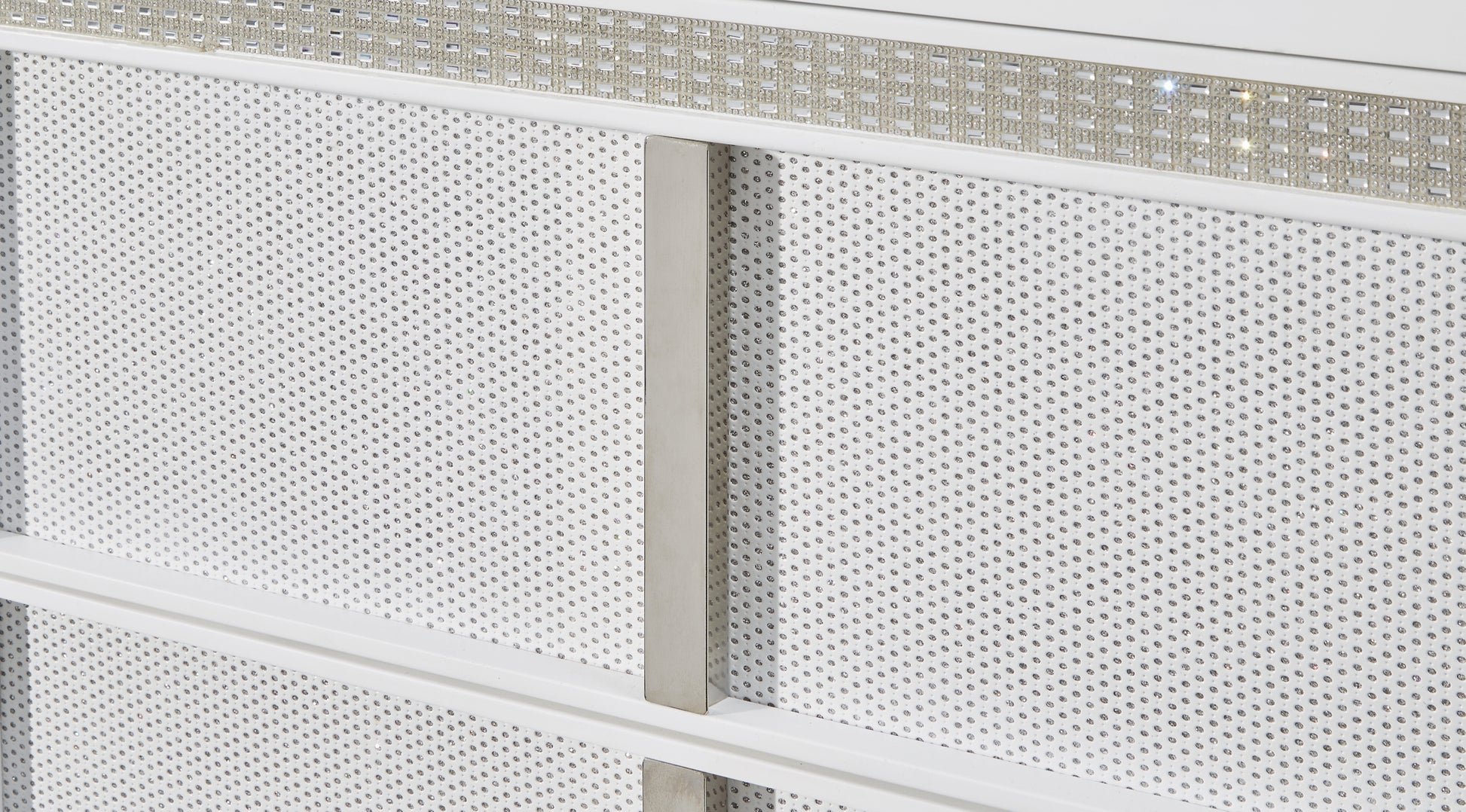 | Details | Made with solid wood components, MDF substrate and decorative laminate, White lacquer finish, Vertical metal drawer pulls, Built-in LED lighting with 3-way dimmer switch, 6 drawers with fully finished interior, dovetail construction and heavy duty ball-bearing side glides, Drawers with rhinestone frames; textured laminate drawer fronts, Power cord included; UL Listed | |