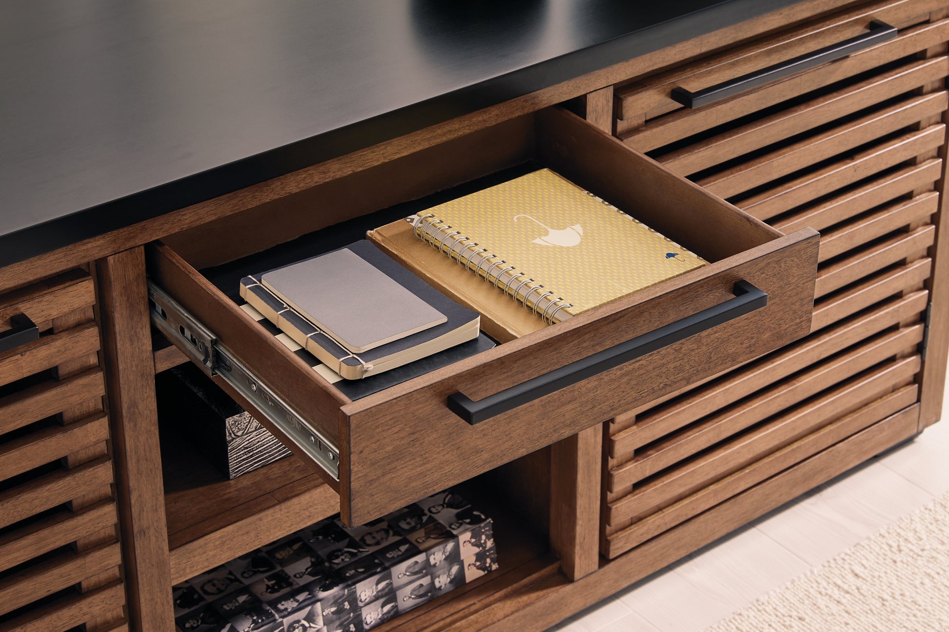 | Details | Includes credenza and desk return, Made with hardwood solids, mango wood veneer and MDF substrates, Two-tone finish (medium warm brown wood tone and matte black), Bar pulls with blackened steel finish, Smooth-gliding drawer, 2 cabinet doors, 2 adjustable shelves, Open storage area, Desk return can be added to either side of the credenza, Assembly required | |
